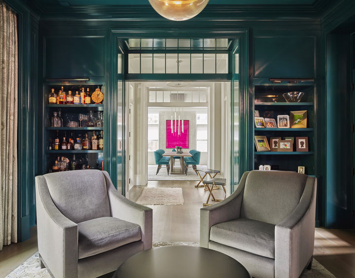 The interior is open and inviting, with bold colors and dynamic patterns throughout, centered around a dramatic glass-enclosed stair tower. Ideal for entertaining, the five-bedroom home offers built-in sleepover nooks in each children’s room, a dining space that accommodates up to 22 guests, and generous indoor-outdoor living areas—perfectly suited for both everyday life and memorable celebrations.